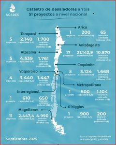 • La Corporación de Bienes de Capital (CBC), junto a la Asociación Chilena de Desalación y Reúso (ACADES) entregaron una actualización de su registro, el que suma 51 proyectos a la fecha en diversos estados de avance y que suministrarán agua para consumo humano, minería, industrias e hidrógeno verde.