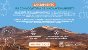 En la oportunidad, serán presentados los desafíos de la primera convocatoria de innovación abierta del ITL, un centro de innovación y desarrollo tecnológico que impulsa soluciones sustentables para la industria, especialmente en minería, energía y litio.